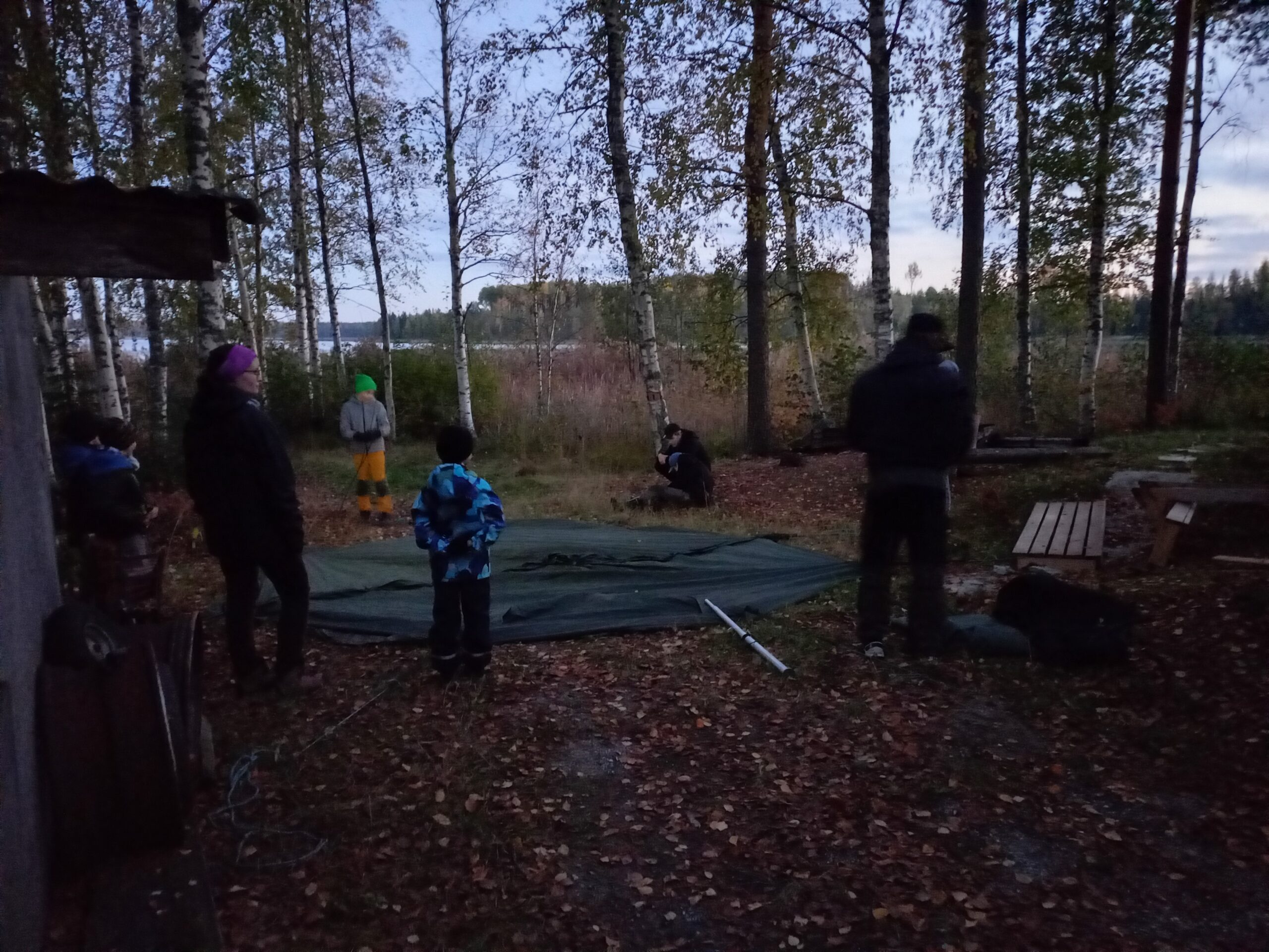 Hawu-teltan pystyttämistä illan hämärtyessä syksyllä