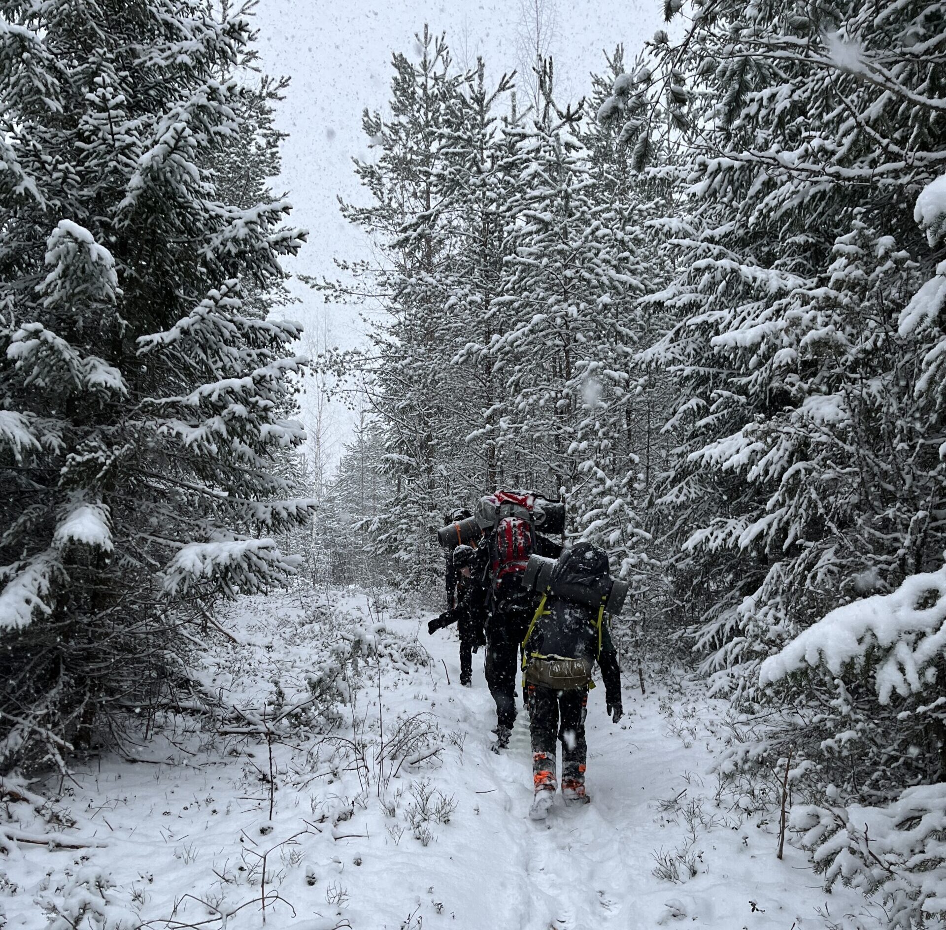 Kolme partiolaista tarpomassa lumisella polulla rinkat selässä